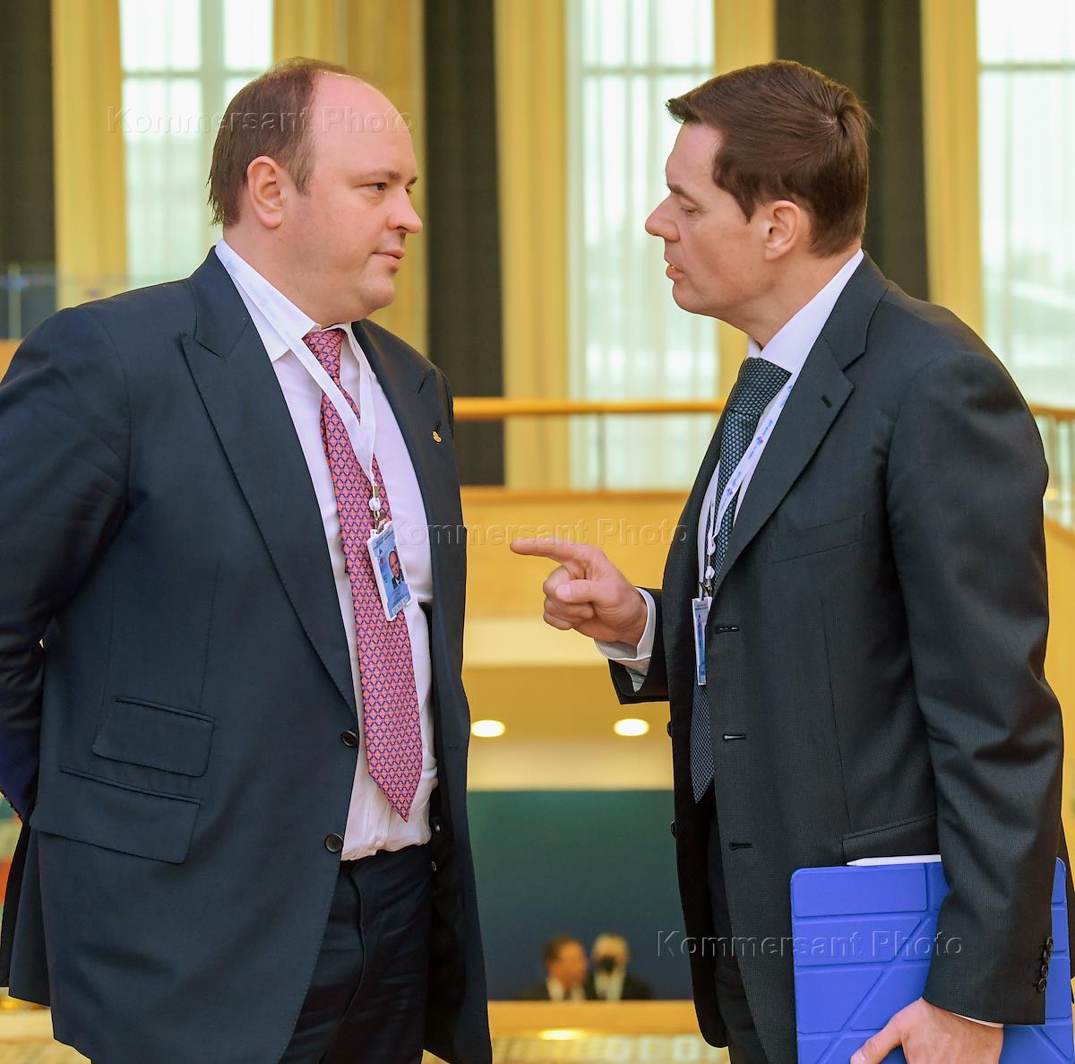Reporting and Election Congress of the Russian Union of Industrialists and Entrepreneurs at the State Kremlin Palace. First Deputy Chairman of the Russian State Duma Alexander Zhukov (left) during the congress.