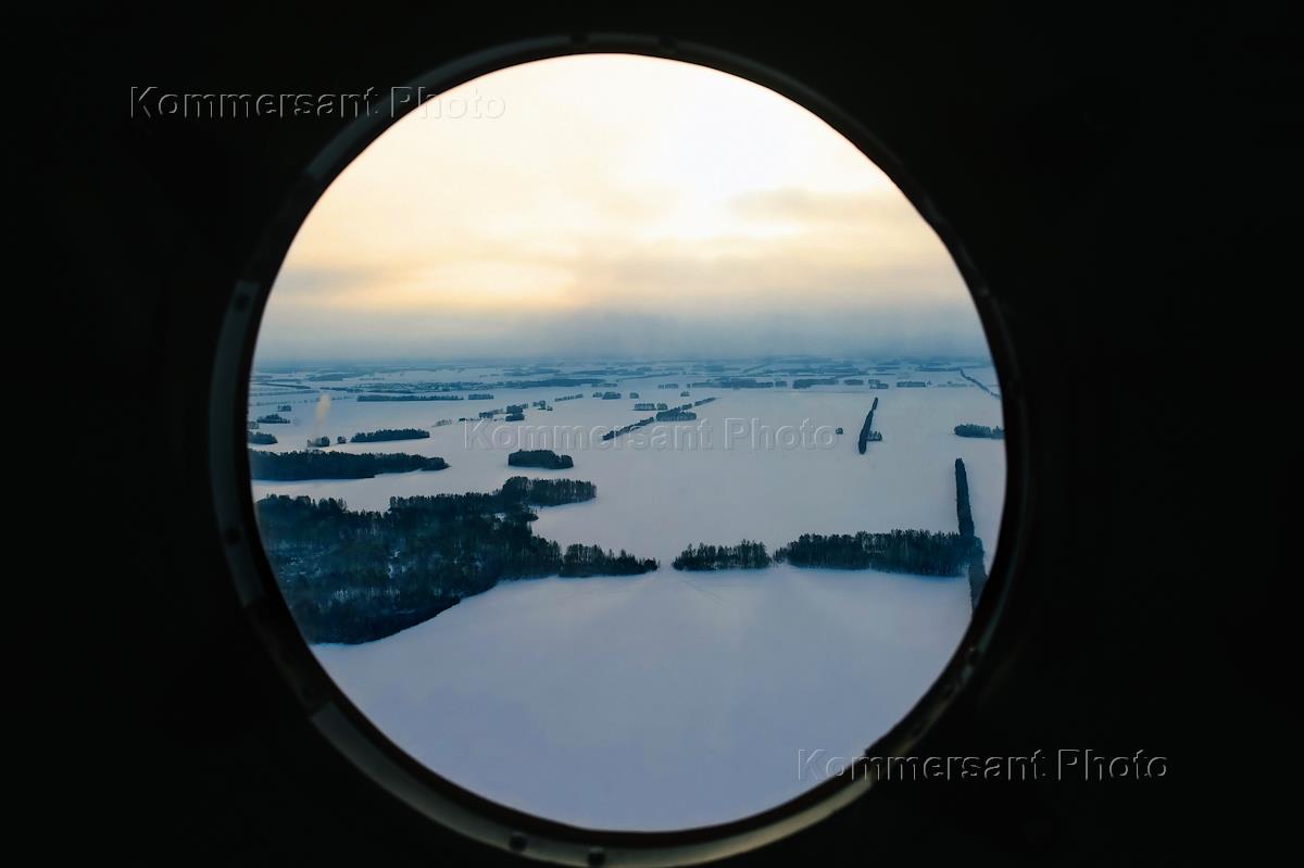 Winter views of the Novosibirsk region from a helicopter window. Genre photography.