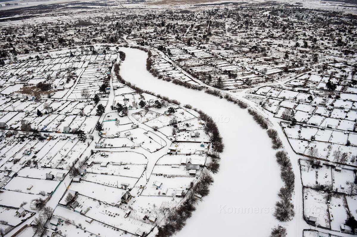 Winter views of the Novosibirsk region from the helicopter window. Genre photography. Summer cottages, covered with snow, by the river.