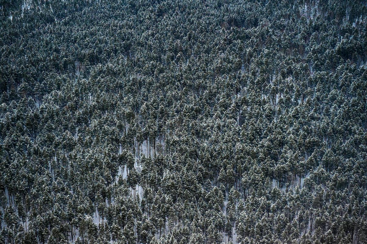 Winter views of the Novosibirsk region from the helicopter window. Genre photography. Winter taiga.