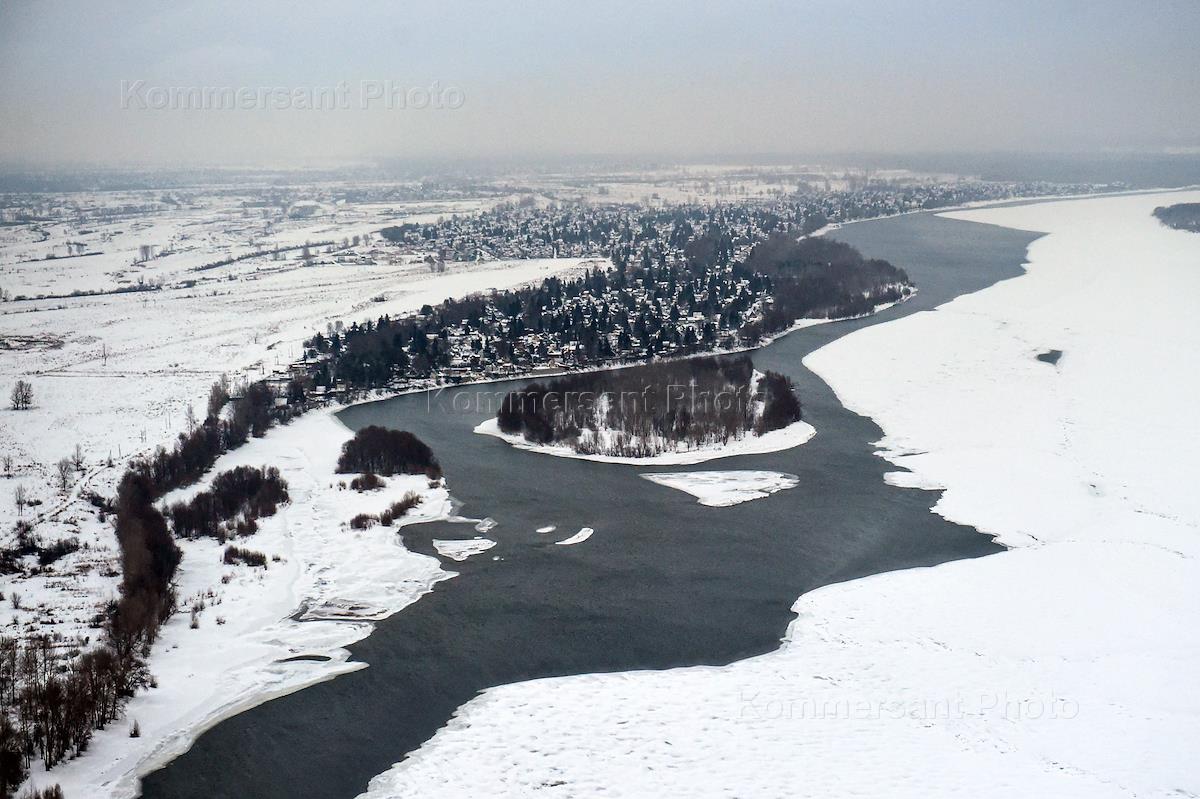 Зимние виды Новосибирской области из иллюминатора вертолета. Жанровая фотографии. Дачные участки, запорошенные снегом, у реки.