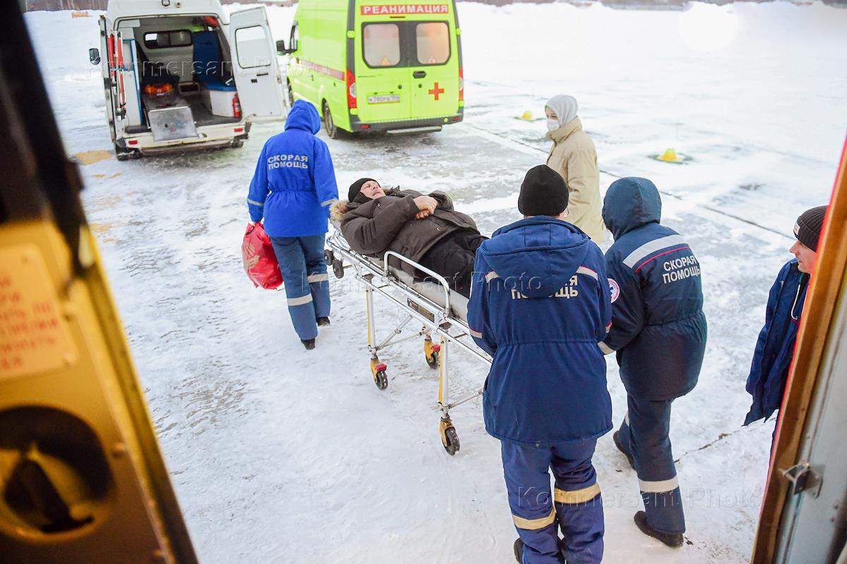 Работа медицинской бригады национальной службы санитарной авиации (НССА) в Новосибирской области. Жанровая фотография. Медицинская бригада санитарной авиации во время транспортировки пациентов.