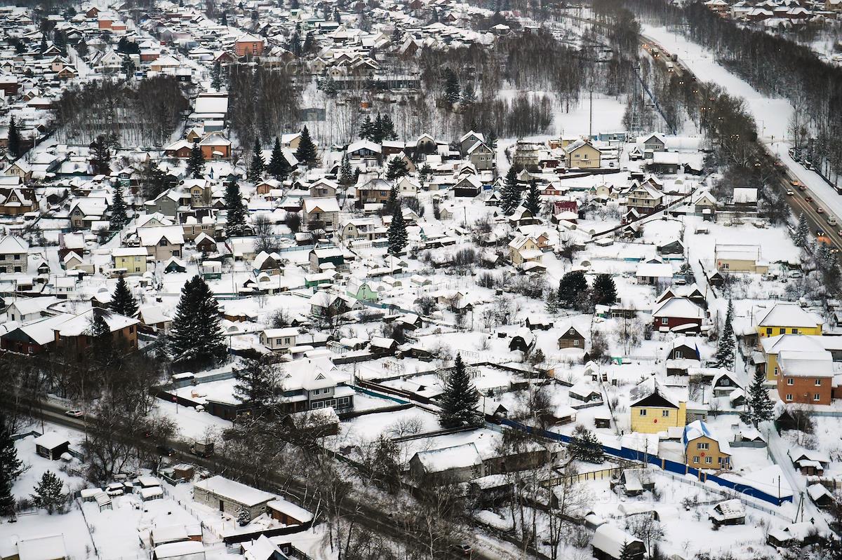 Зимние виды Новосибирской области из иллюминатора вертолета. Жанровая фотографии. Дачные участки, запорошенные снегом.