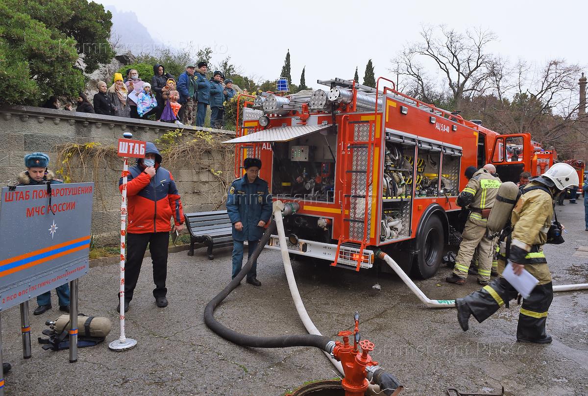 Fire-fighting exercises of the Ministry of Emergencies of Russia in the Republic of Crimea on the territory of the Alupka Palace and Park Museum-Reserve (Vorontsov Palace). Genre photography.