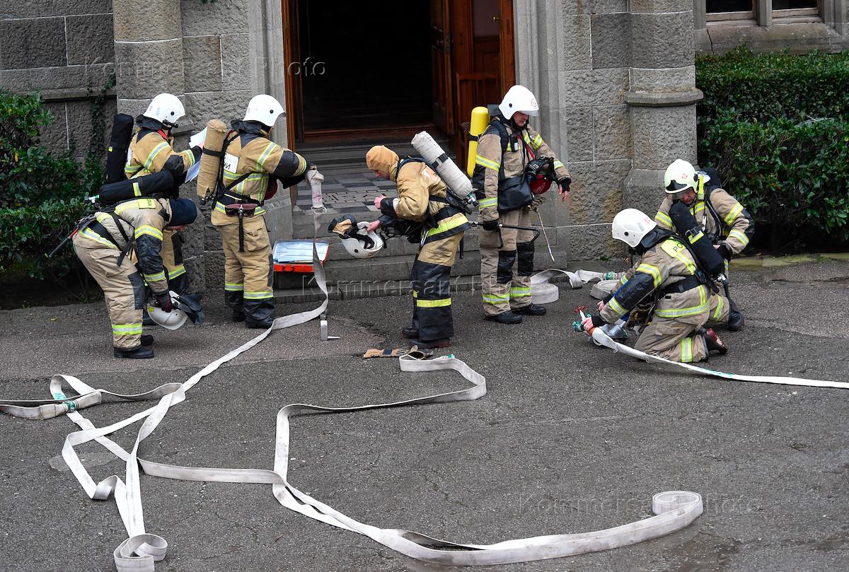 Fire-fighting exercises of the Ministry of Emergencies of Russia in the Republic of Crimea on the territory of the Alupka Palace and Park Museum-Reserve (Vorontsov Palace). Genre photography.