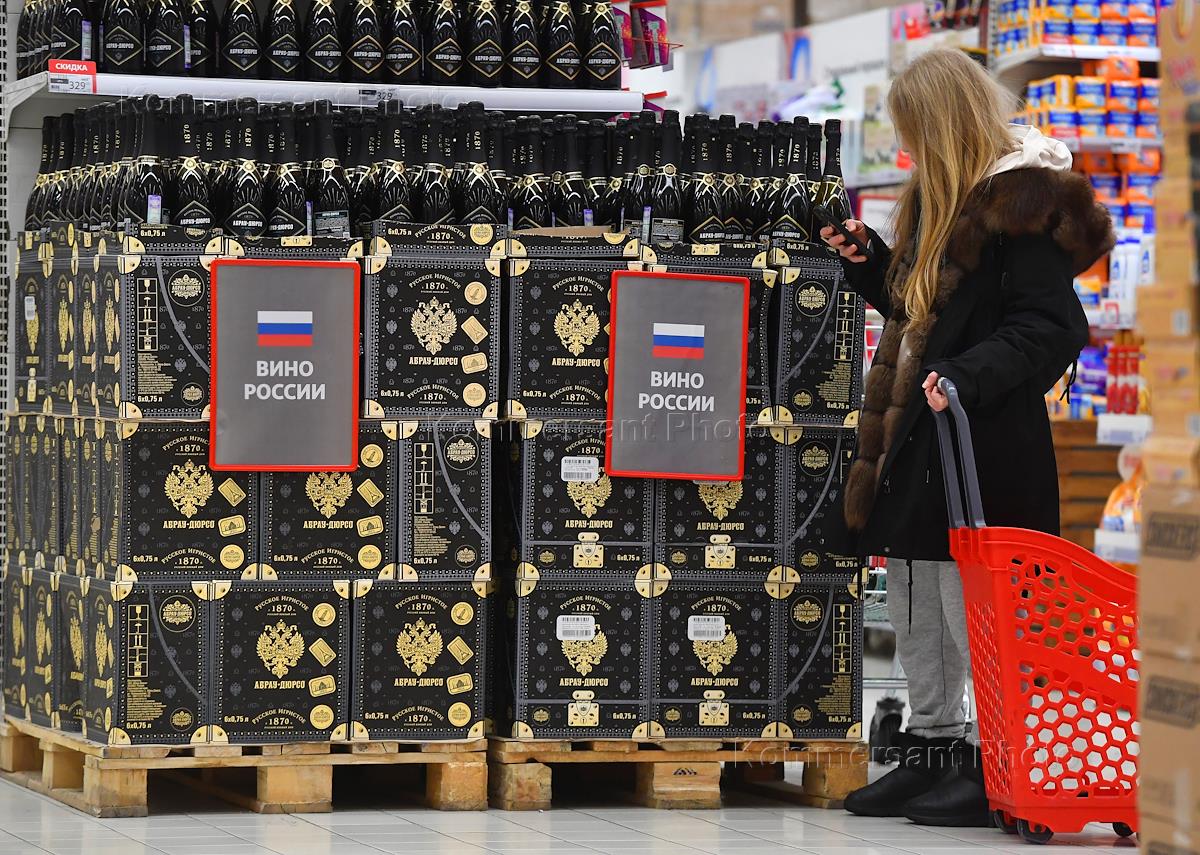 Genre photography. The work of the Auchan hypermarket in the Gagarinsky shopping center. Showcase with champagne and sparkling wine made in Russia.