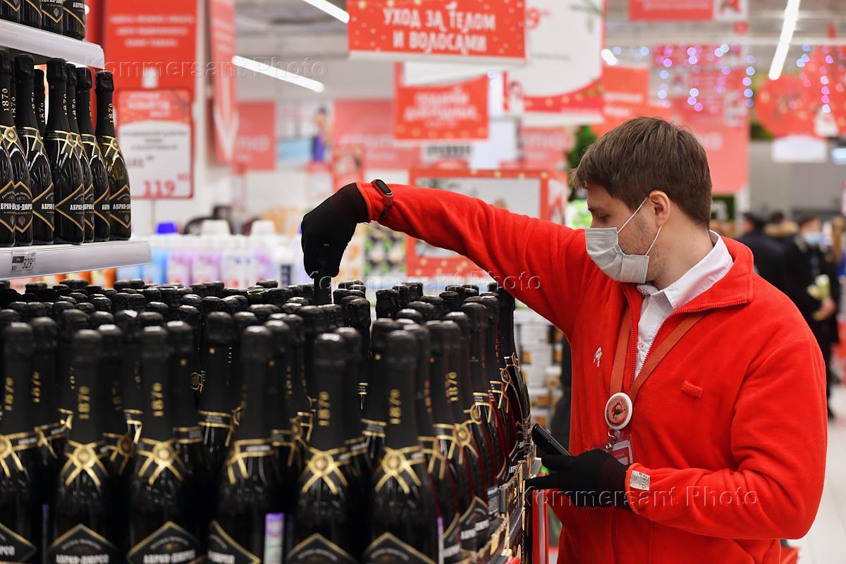 Genre photography. The work of the Auchan hypermarket in the Gagarinsky shopping center. A store employee displays bottles of sparkling wine.