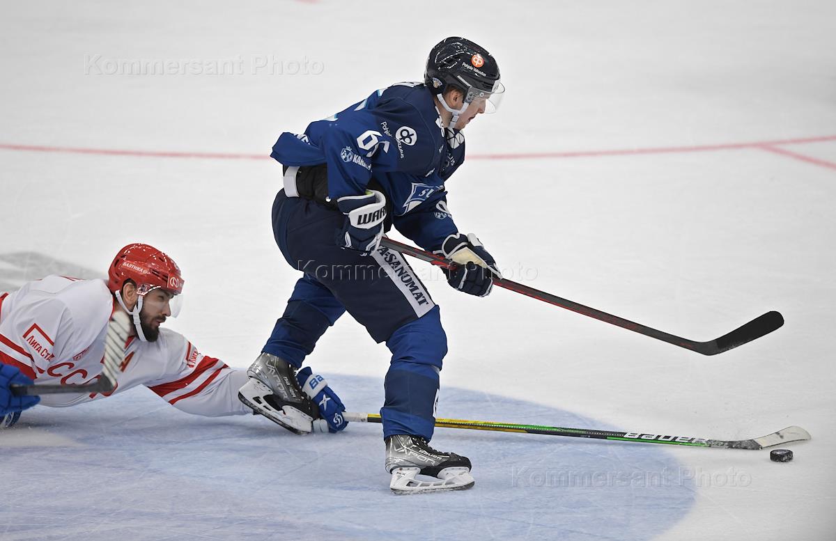 Hockey Channel One Cup. A match between the national teams of Russia and Finland at the CSKA-Arena stadium. Russian national team player Sergei Plotnikov (right) and Finland national team player Ville Pokka (left) during a match.