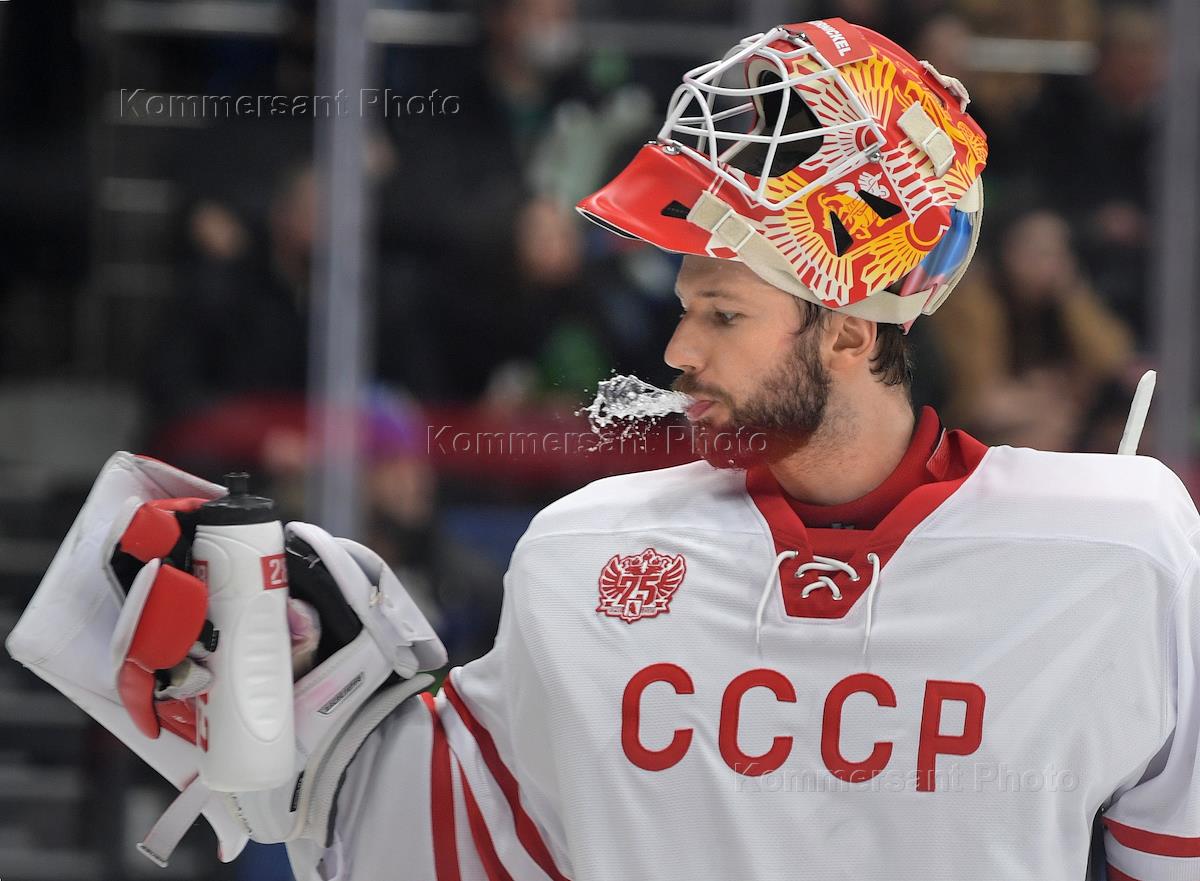 "Channel One Cup" in hockey. A match between the national teams of Russia and Finland at the CSKA-Arena stadium. Russian national team goalkeeper Ivan Fedotov during a match.