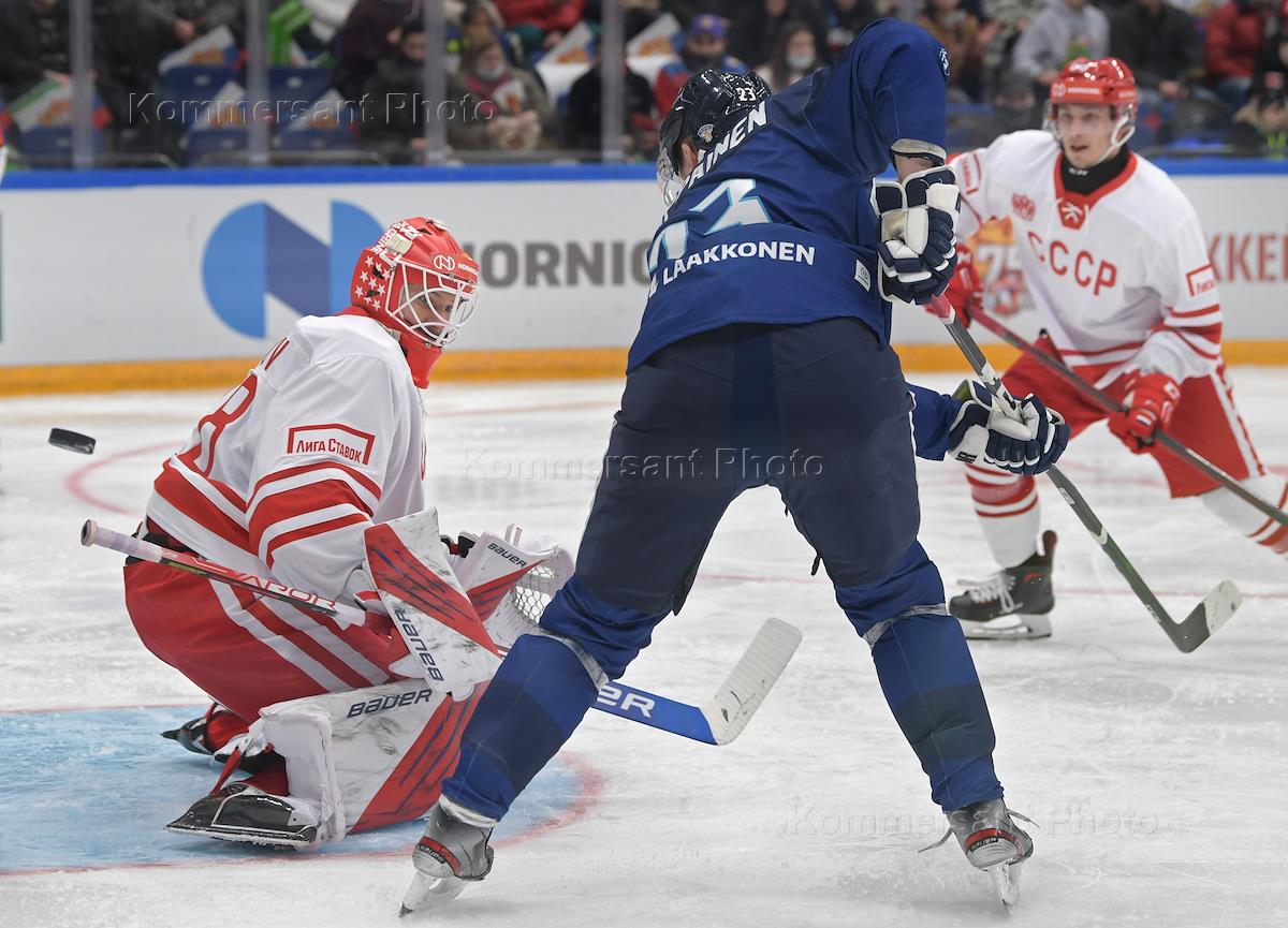"Кубок Первого канала" по хоккею. Матч между сборными командами России и Финляндии на стадионе "ЦСКА-Арена". Вратарь сборной Финляндии Харри Сятери (слева) во время матча.