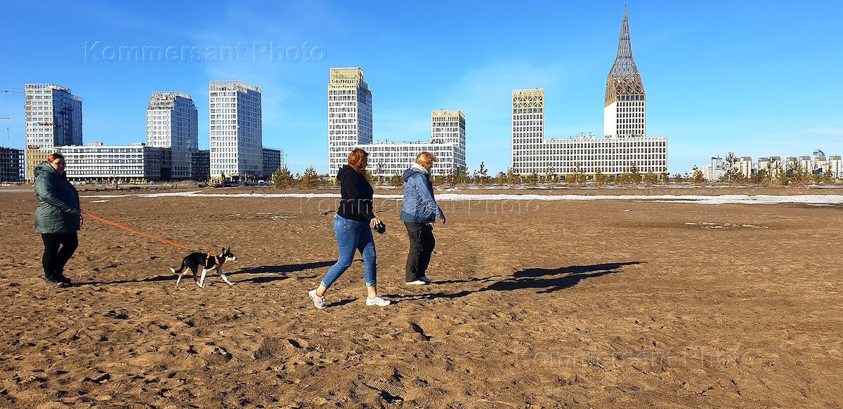Views of St. Petersburg. Residential complex "Golden City". Genre photography. People walk on the sand. New buildings on Vasilievsky Island in reclaimed areas in the Gulf of Finland.