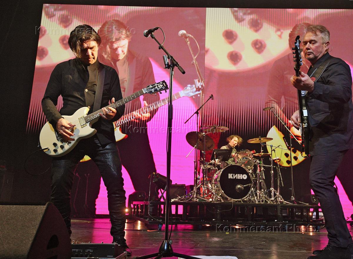 Music festival "Top of Rock II". Performance of the rock groups "Kino" and "DDT" on the main stage of the Music Media Dome. Members of the Kino group during a performance.