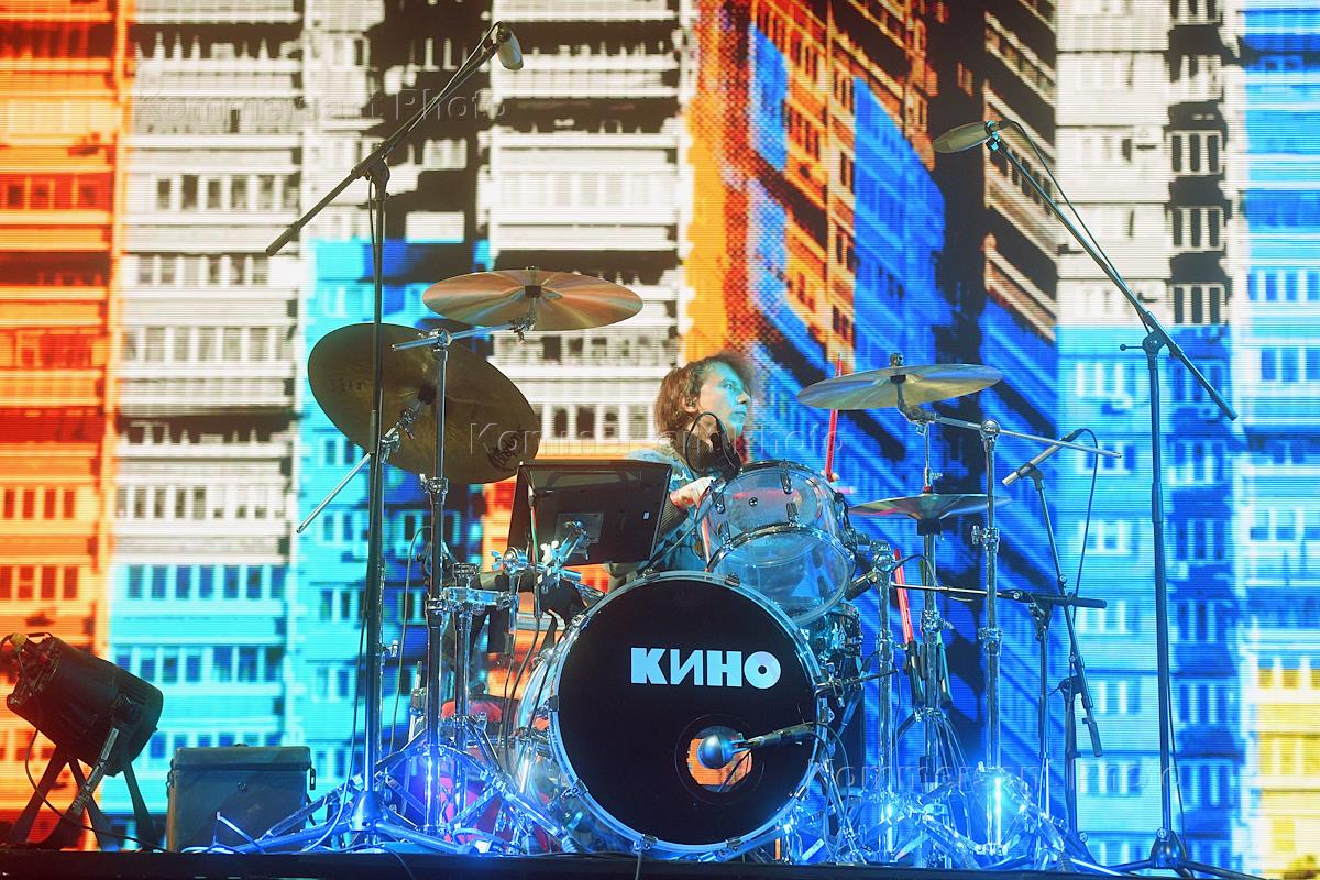 Музыкальный фестиваль "Вершина Рока II". Выступление рок-групп "Кино" и "ДДТ" на основной сцене Music Media Dome. Барабанщик группы "Кино" Олег Шунцов во время выступления.