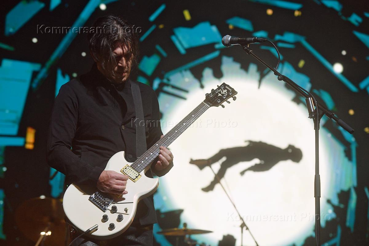 Music festival "Top of Rock II". Performance of the rock groups "Kino" and "DDT" on the main stage of the Music Media Dome. Igor Tikhomirov, member of the Kino group, performing.