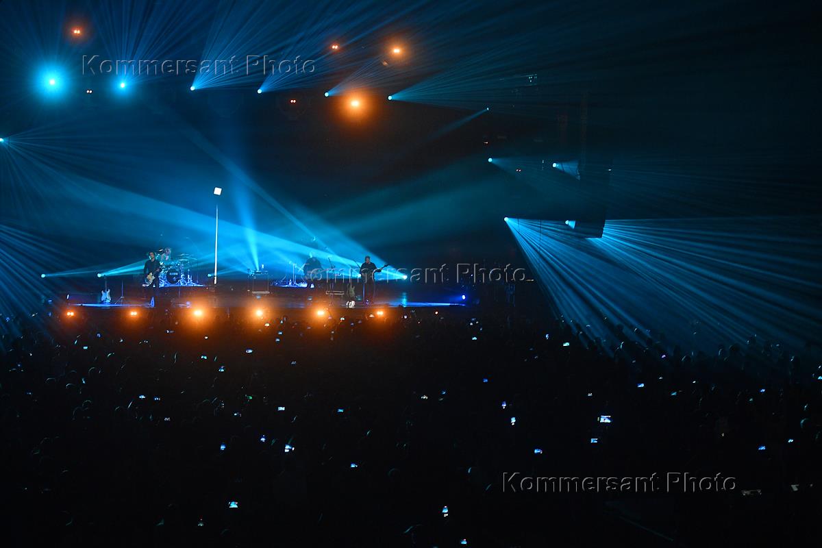 Music festival "Top of Rock II". Performance of the rock bands "Kino" and "DDT" on the main stage of the Music Media Dome. The Kino group during a performance.