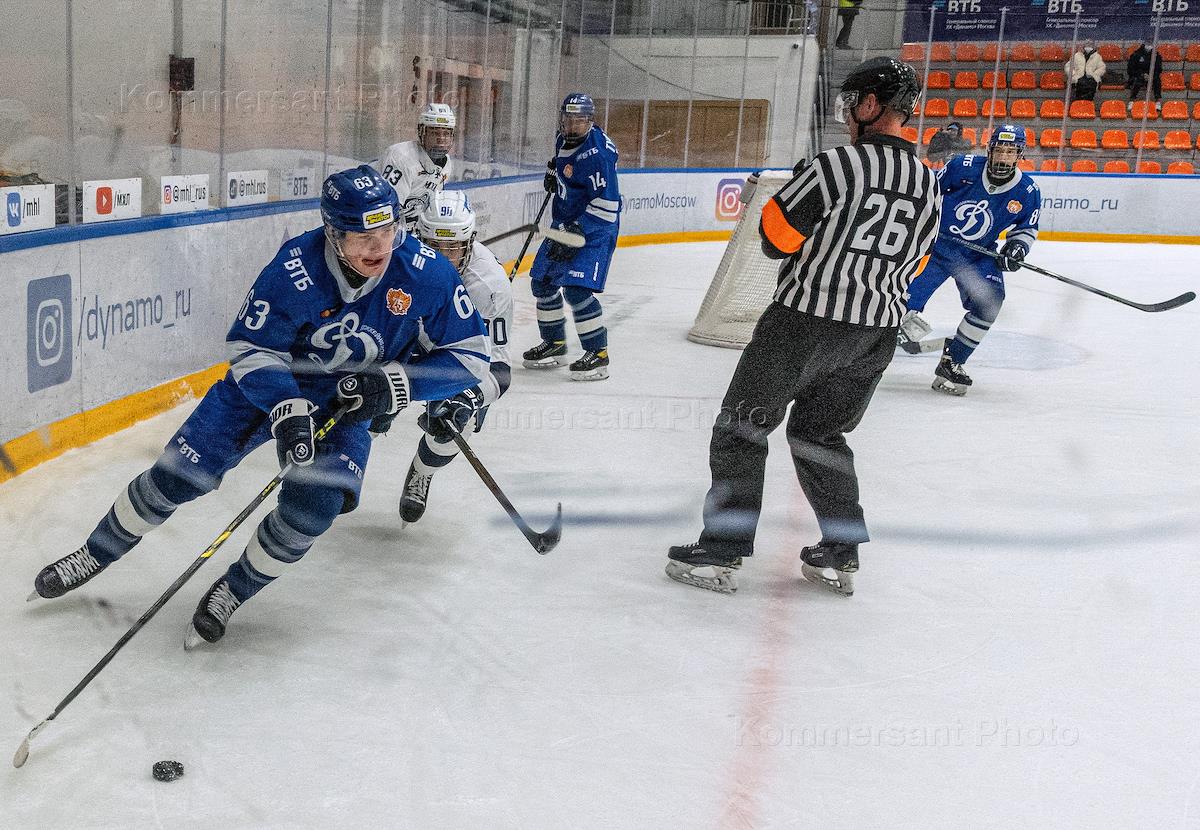 Youth Hockey League. A match between the teams Dynamo Moscow and Dynamo St. Petersburg at the Vladimir Petrov Arena Krasnogorsk. Dynamo St. Petersburg player Semyon Sorokin, left, and Dynamo Moscow player Magomed Sharakanov, center, during a match.