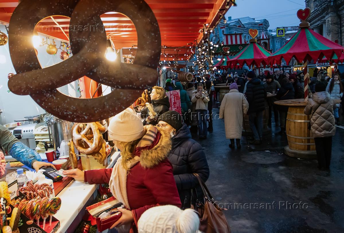 Views of St. Petersburg. Genre photography. Work of the Christmas fair at Manezhnaya Square.