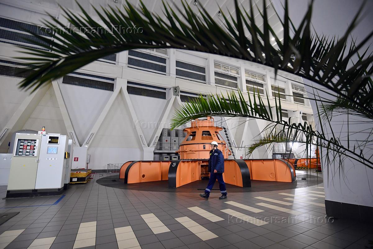 Work of the Bratsk hydroelectric power station named after the 50th anniversary of October on the Angara River. Genre photography.