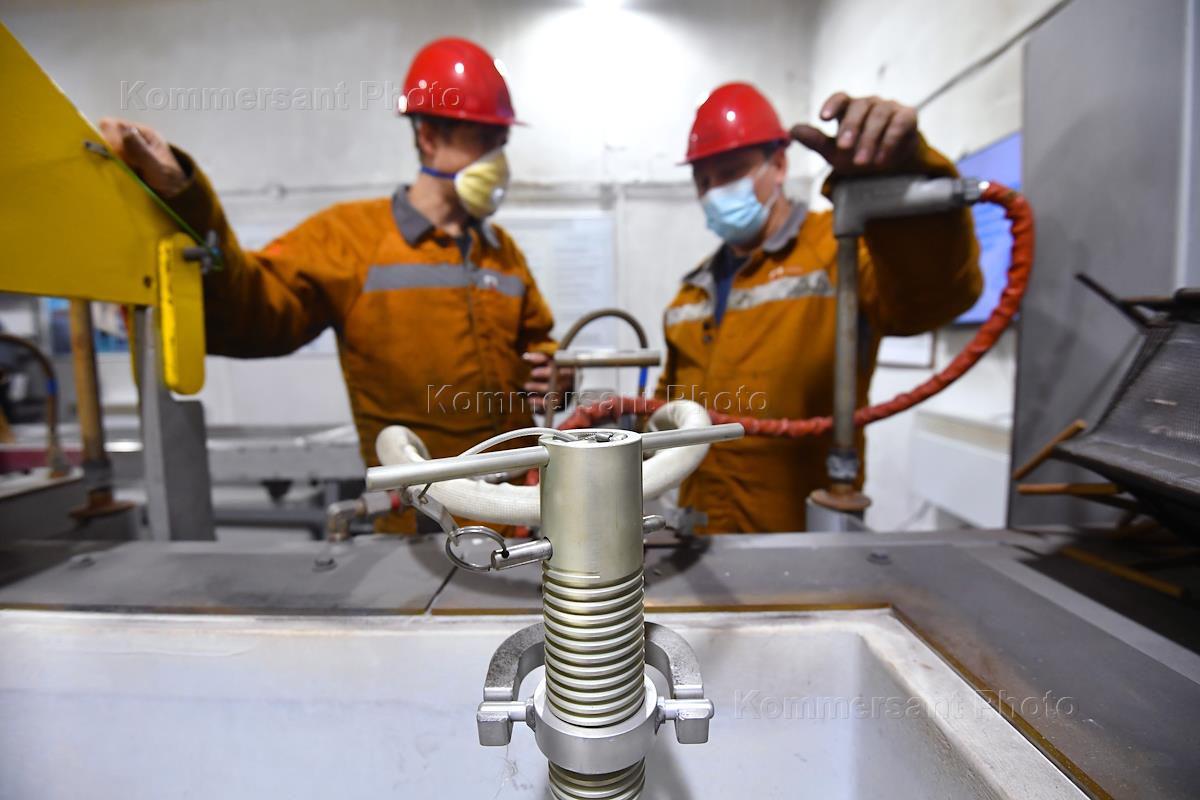 The work of the Bratsk aluminum smelter of the RUSAL company. Genre photography. Employees of the plant at the entrance to the "dry" type gas cleaning unit No. 52.