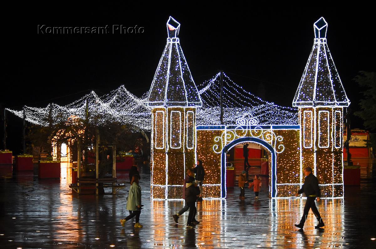 Views of Yalta. Genre photography. New Year's decoration of the city. Pavilion at the New Year's fair on the embankment.