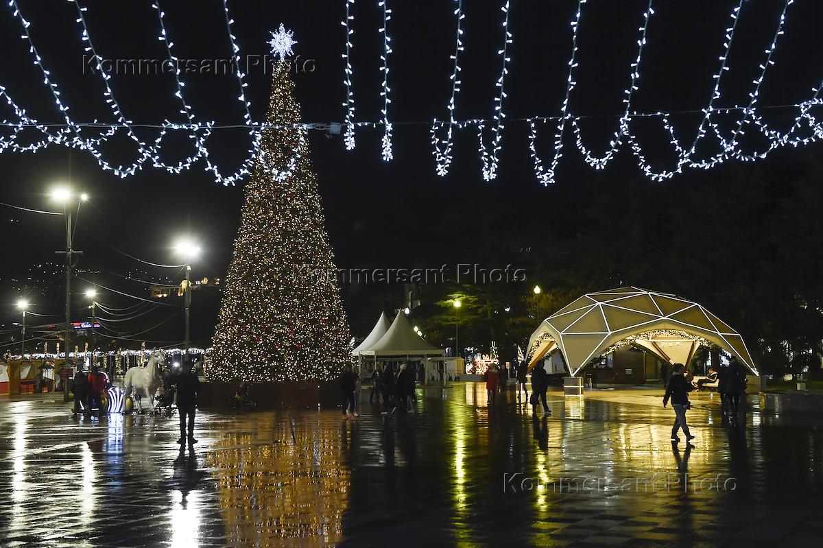 Views of Yalta. Genre photography. New Year's decoration of the city. New Year's installation at the main tree of the city on the embankment.