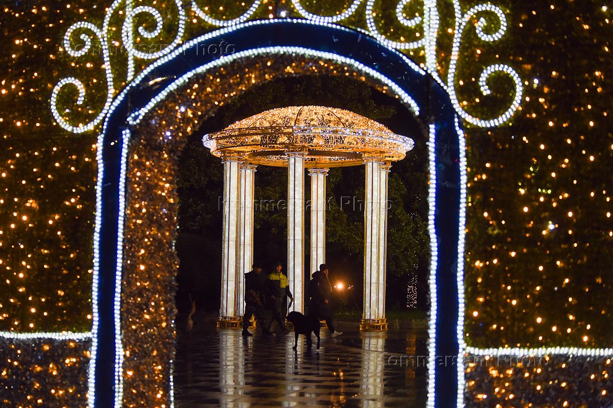 Views of Yalta. Genre photography. New Year's decoration of the city. Pavilion at the New Year's fair on the embankment.