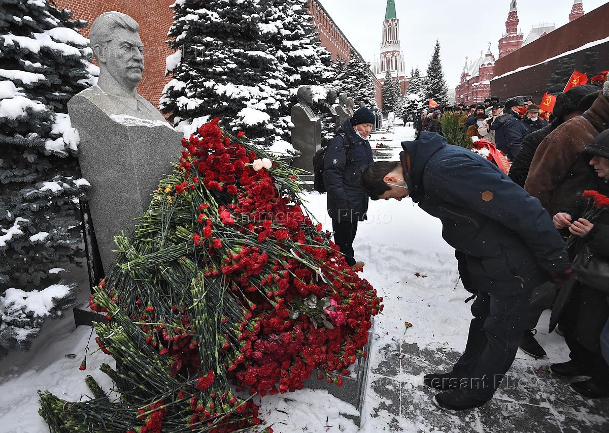 Церемония возложения венков и цветов к могиле главы правительства СССР и генерального секретаря ЦК ВКП Иосифа Сталина у Кремлевской стены в день его 142-летия, организованная КПРФ. Участники во время церемонии.