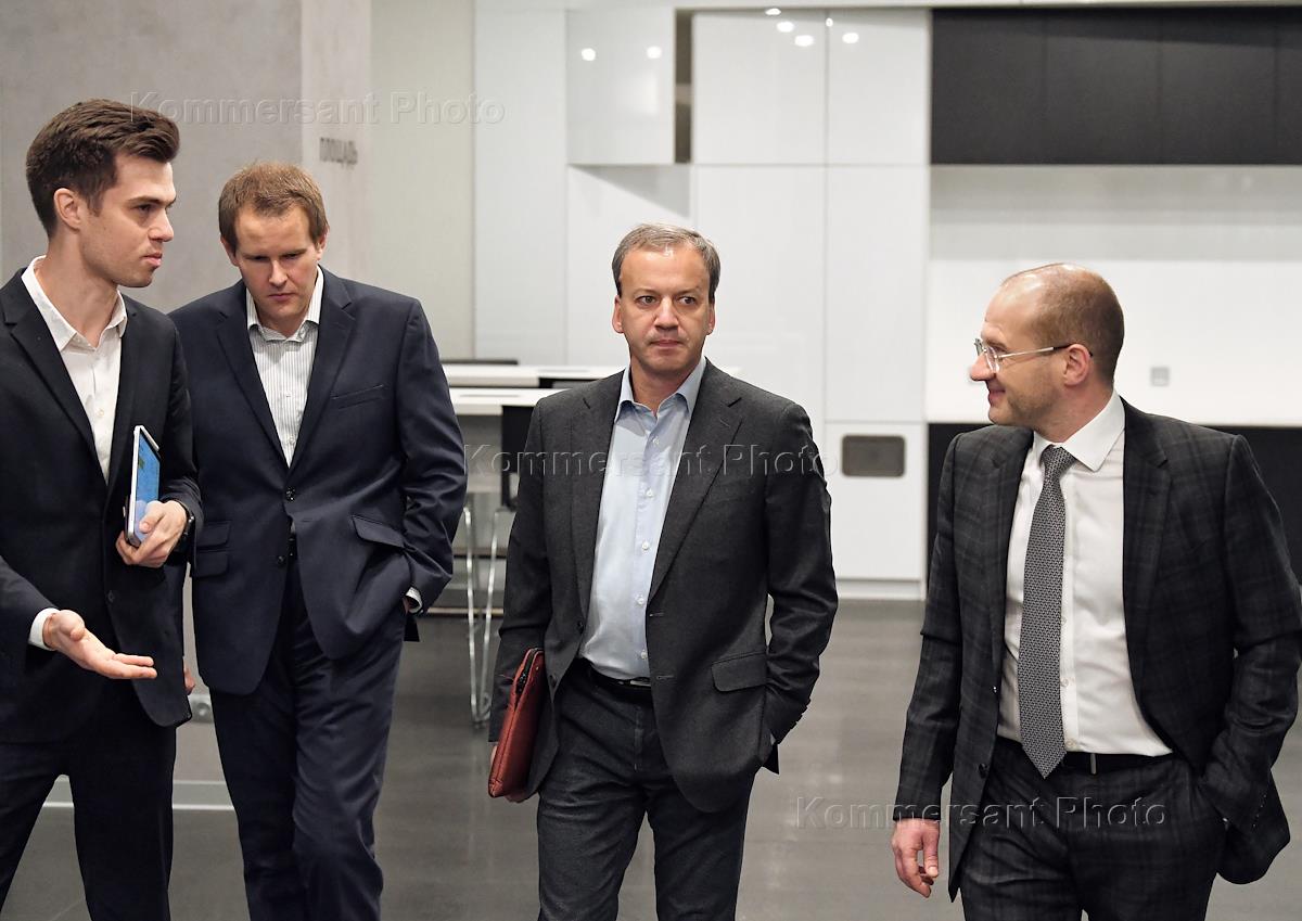 Подведение итогов ежегодной акселерационной программы в сфере девелопмента, строительства, продаж и эксплуатации объектов недвижимости Build UP в городской лаборатории ВЭБ.РФ. Председатель фонда "Сколково", президент Международной шахматной федерации (FIDE) Аркадий Дворкович (в центре), директор по развитию Кластера энергоэффективных технологий Фонда "Сколково" Михаил Тыкучинский (справа) и генеральный директор ООО "ПроГород" (группа ВЭБ.РФ) Александр Чеботарев (слева) во время подведения итогов.