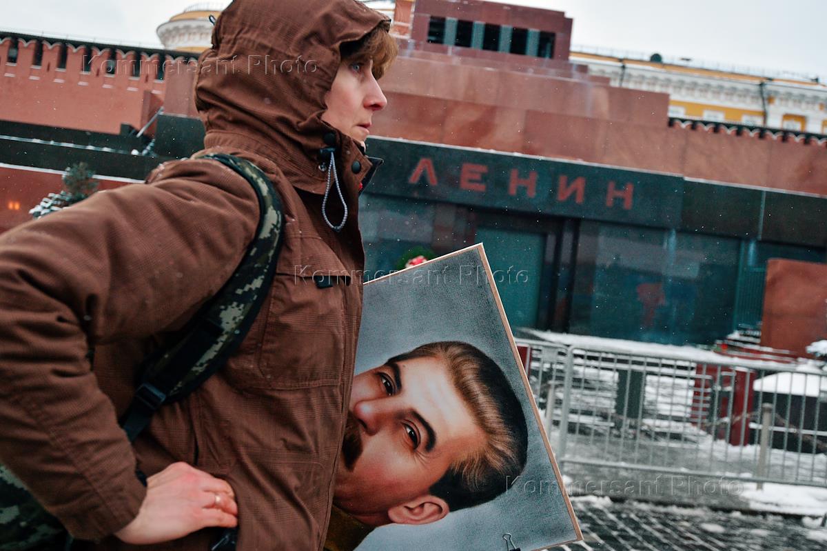 The ceremony of laying wreaths and flowers at the grave of the head of the government of the USSR and the general secretary of the Central Committee of the All-Union Communist Party of the Soviet Union Joseph Stalin at the Kremlin wall on the day of his 142nd birthday, organized by the Communist Party. Participants during the ceremony.