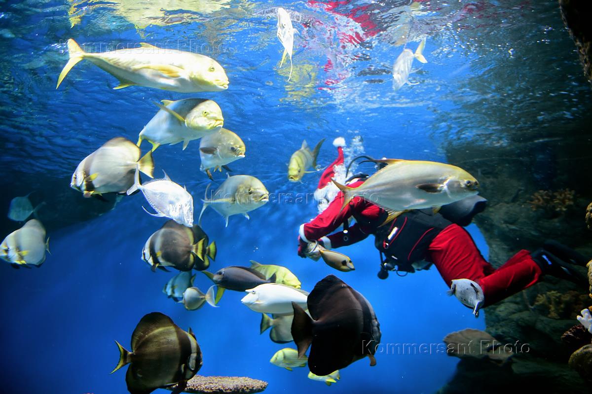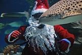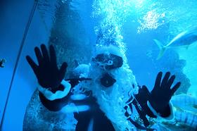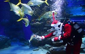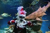 Дайвер в костюме Санта Клауса кормит рыб в аквариуме Центра океанографии и морской биологии "Дельфиния".