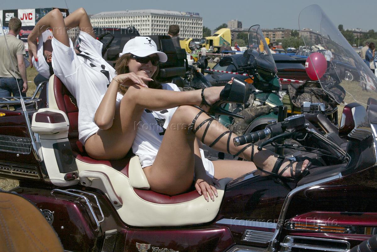 Открытие Московского международного автомобильного шоу "Автоэкзотика - 2006" на территории аэродрома Тушино. Девушки модели на мотоцикле.