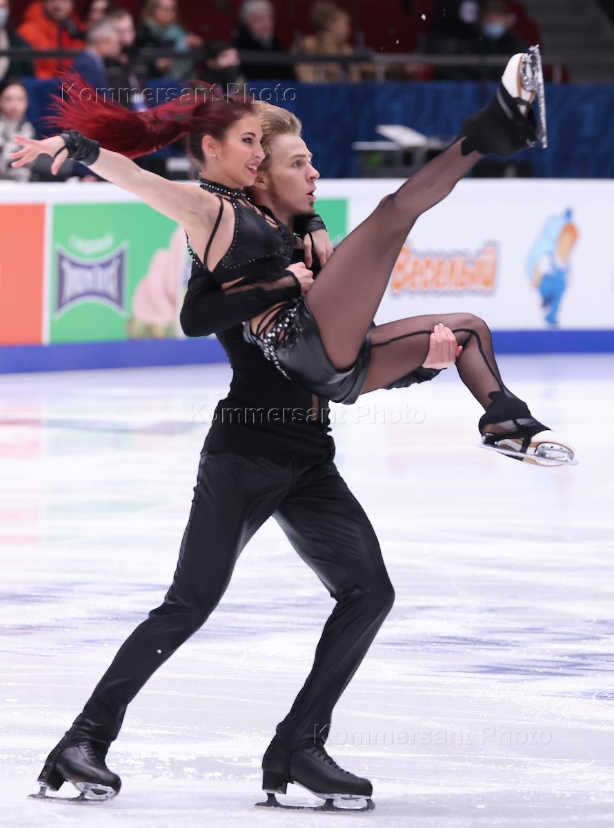 Ростелеком-Чемпионат России - 2022 по фигурному катанию на коньках в спорткомплексе "Юбилейный". Танцы на льду. Ритм-танец. Фигуристы Виктория Синицина (слева) и Никита Кацалапов (справа) во время выступления.