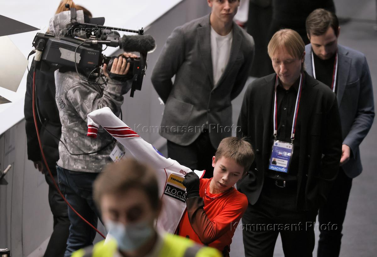 Ростелеком-Чемпионат России- 2022 по фигурному катанию на коньках в спорткомплексе "Юбилейный". Мужчины. Короткая программа. Олимпийский чемпион по фигурному катанию, тренер Евгений Плющенко (в центре) и фигурист Кирилл Сарновский (третий справа) во время чемпионата.