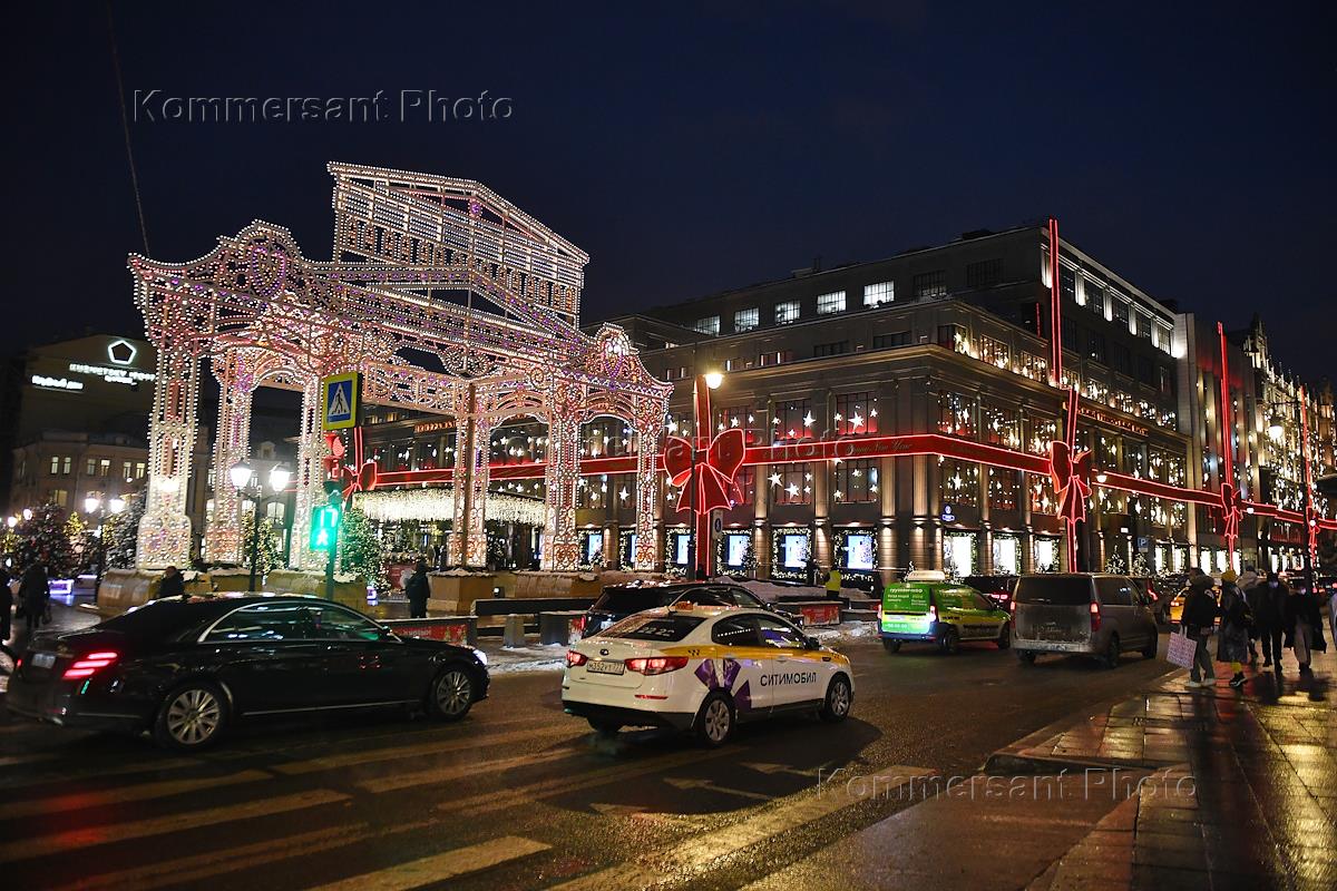 Виды Москвы. Новогоднее украшение города. Жанровая фотография. Здание ЦУМа в виде подарочной коробки.