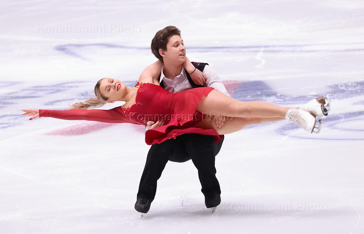 Ростелеком - Чемпионат России по фигурному катанию 2022 в спорткомплексе "Юбилейный". Танцы на льду. Произвольная программа. Фигуристы Ангелина Лазарева и Максим Прокофьев во время выступления.