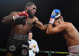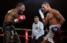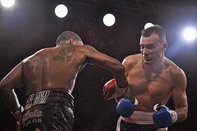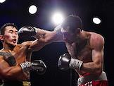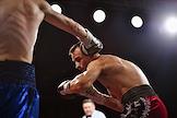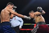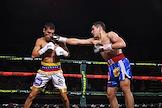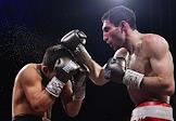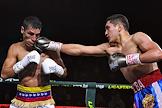Вечер профессионального бокса, организованный промоутерской компанией Dynamo boxing promotion, в УСК "Крылья Советов". Российский боксер Альберт Батыргазиев (слева) и венесуэльский боксер Франклин Мансанилья (справа) во время поединка.