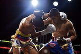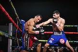 Вечер профессионального бокса, организованный промоутерской компанией Dynamo boxing promotion, в УСК "Крылья Советов". Российский боксер Сослан Баев (справа) и монгольский боксер Эрдэнэбатын Цендбаатар (слева) во время поединка.