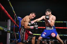 Вечер профессионального бокса, организованный промоутерской компанией Dynamo boxing promotion, в УСК "Крылья Советов". Российский боксер Муслим Гаджимагомедов (справа) и колумбийский боксер Дейбис Беррокаль (слева) во время поединка.