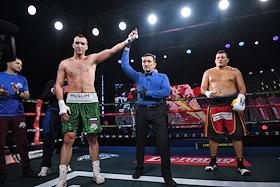 Вечер профессионального бокса, организованный промоутерской компанией Dynamo boxing promotion, в УСК "Крылья Советов". Российский боксер Максим Власов (в центре) и доминиканский боксер Феликс Валера (справа) после поединка.