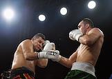 Вечер профессионального бокса, организованный промоутерской компанией Dynamo boxing promotion, в УСК "Крылья Советов". Российские боксеры Харитон Агрба (слева) и Петр Петров (справа) во время поединка.