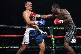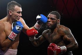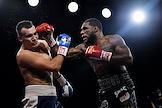 Вечер профессионального бокса, организованный промоутерской компанией Dynamo boxing promotion, в УСК "Крылья Советов". Российский боксер Максим Власов (слева) и доминиканский боксер Феликс Валера (справа) во время поединка.