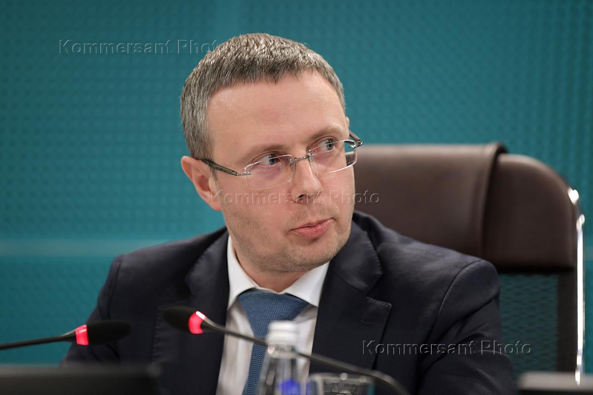 Пресс-конференция Федеральной антимонопольной службы России (ФАС), АО "СПбМТСБ" и ОАО "РЖД", посвященная обсуждению формирования биржевой инфраструктуры реализации нефтепродуктов с транспортировкой железнодорожным транспортом, в гибридном формате, в ФАС России. Руководитель ФАС России Максим Шаскольский во время пресс-конференции.