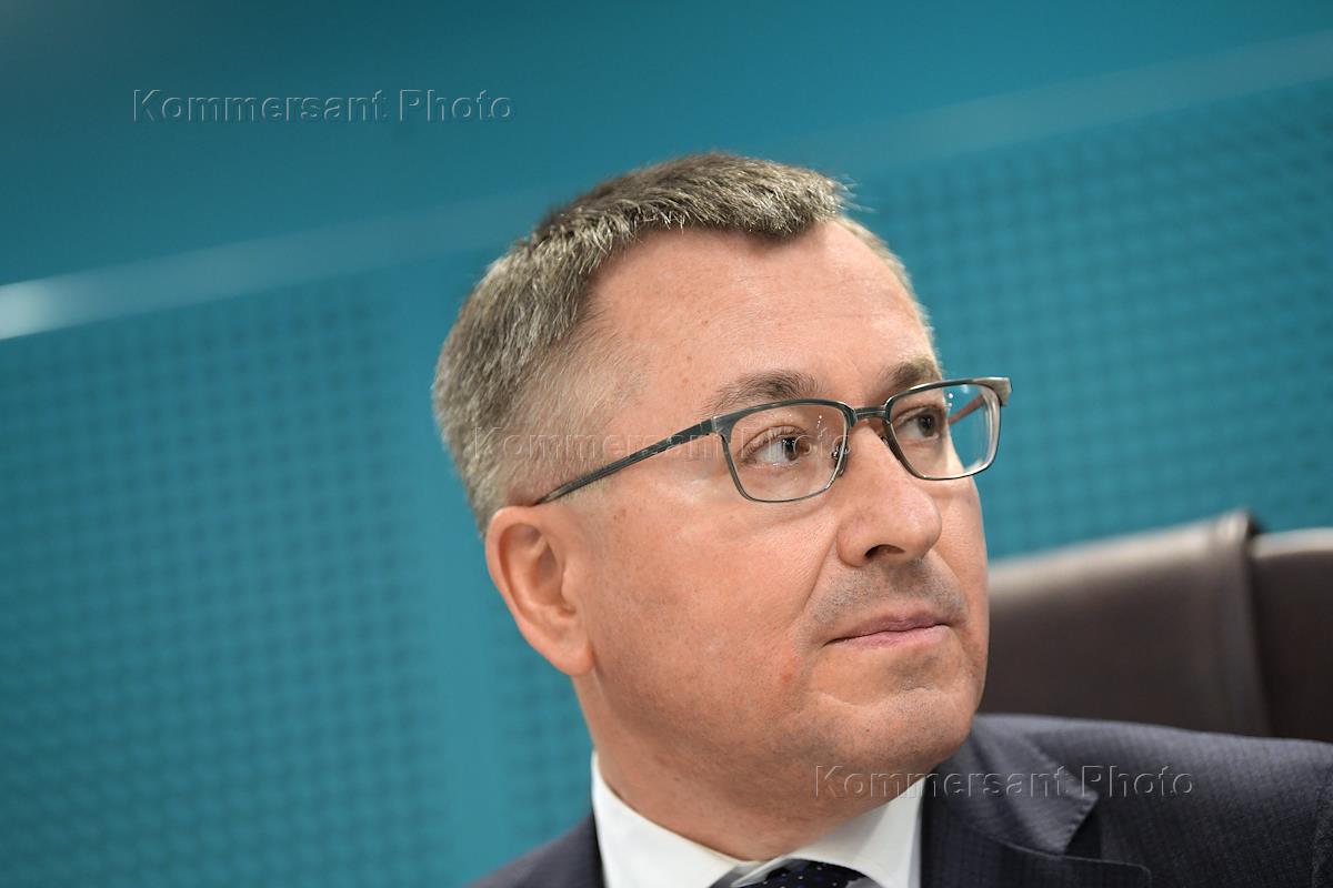 Пресс-конференция Федеральной антимонопольной службы России (ФАС), АО "СПбМТСБ" и ОАО "РЖД", посвященная обсуждению формирования биржевой инфраструктуры реализации нефтепродуктов с транспортировкой железнодорожным транспортом, в гибридном формате, в ФАС России. Президент Санкт-Петербургской международной товарно-сырьевой биржи (АО "СПбМТСБ") Алексей Рыбников перед началом пресс-конференции.