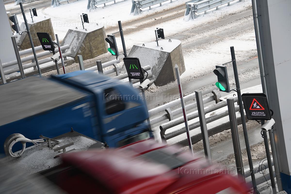 Торжественная церемония открытия магистрали М-1 "Беларусь" после реконструкции. Жанровая фотография. Автомобили на пункте оплаты проезда.