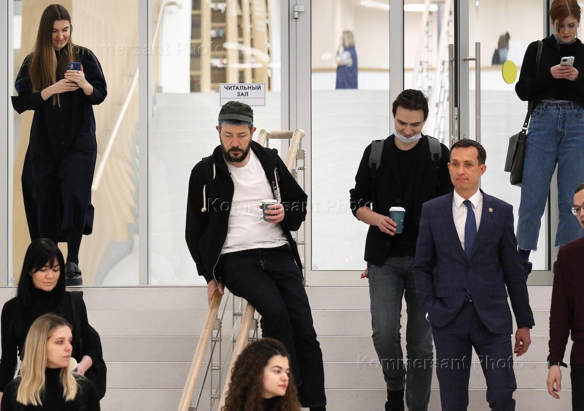 Общественная дискуссия на тему "Современный облик умных городов" в национальной библиотеке Татарстана. Дизайнер Артемий Лебедев (в центре) перед началом дискуссии.