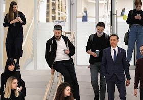 Общественная дискуссия на тему "Современный облик умных городов" в национальной библиотеке Татарстана. Дизайнер Артемий Лебедев (в центре) перед началом дискуссии.