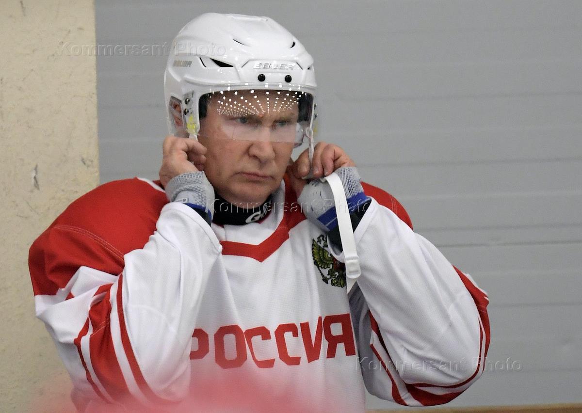 Рабочая поездка президента России Владимира Путина в Санкт-Петербург. Товарищеский хоккейный матч с участием президента России Владимира Путина и президента Белоруссии Александр Лукашенко в ледовом дворце детско-юношеской спортивной школы "Манеж" в Стрельне. Президент России Владимир Путин во время матча.