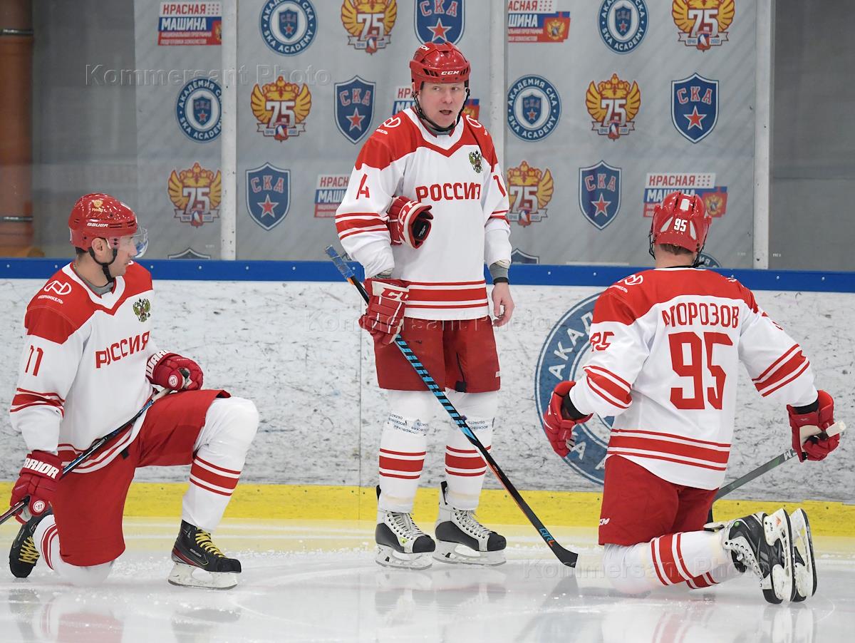 Рабочая поездка президента России Владимира Путина в Санкт-Петербург. Товарищеский хоккейный матч с участием президента России Владимира Путина и президента Белоруссии Александр Лукашенко в ледовом дворце детско-юношеской спортивной школы "Манеж" в Стрельне. Слева направо: член комитета Государственной думы России по экологии и природным ресурсам и охране окружающей среды Вячеслав Фетисов, хоккеисты Илья Ковальчук, Валерий Каменский, Алексей Касатонов и президент России Владимир Путин во время матча.