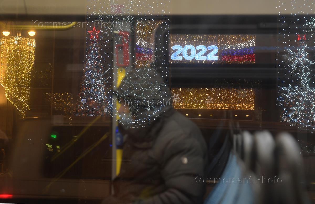 Жанровая фотография. Пассажир в салоне городского автобуса в защитной маске на лице. Новогодняя иллюминация отражается в окне автобуса.