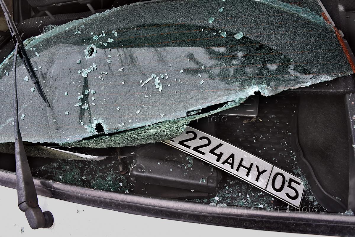 Политическая обстановка в Казахстане. Массовые акции, вызванные ростом цен на топливо. Жанровая фотография. Разбитое стекло легкового автомобиля на улице Алматы.